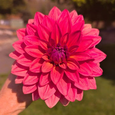 A beautiful bloom that shimmers in the sunlight. The centers are purple while the outer petals range from raspberry to coral. The foliage and stems are dark. A good cut flower. Plant height is 48".