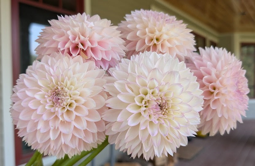 Light cream to pink petals edged in darker pink. Sturdy plant with strong stemmed blooms. Another favorite on our farm! Plant height is 48".